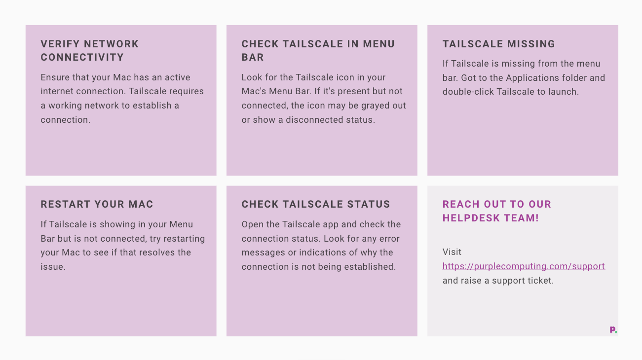 • Tailscale should be automatically enabled and connected via your organisation’s system.